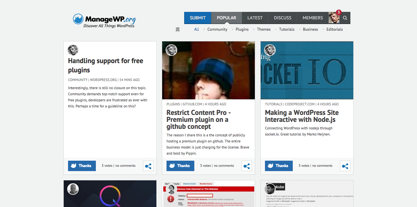 Our own ManageWP.org community started out as a ‘reddit for WordPress’. It established itself as a site that captures the pulse of the WordPress ecosystem, and the main driving force of the community is the high standard of quality, no spam, strict content curation and strong membership. ManageWP.org helped discover over 1,500 new blogs and authors and with the launch of the Plugin Discovery Tool hopes to help discover best new plugins and plugin authors. Our future plans include creating a real-time WordPress events calendar.