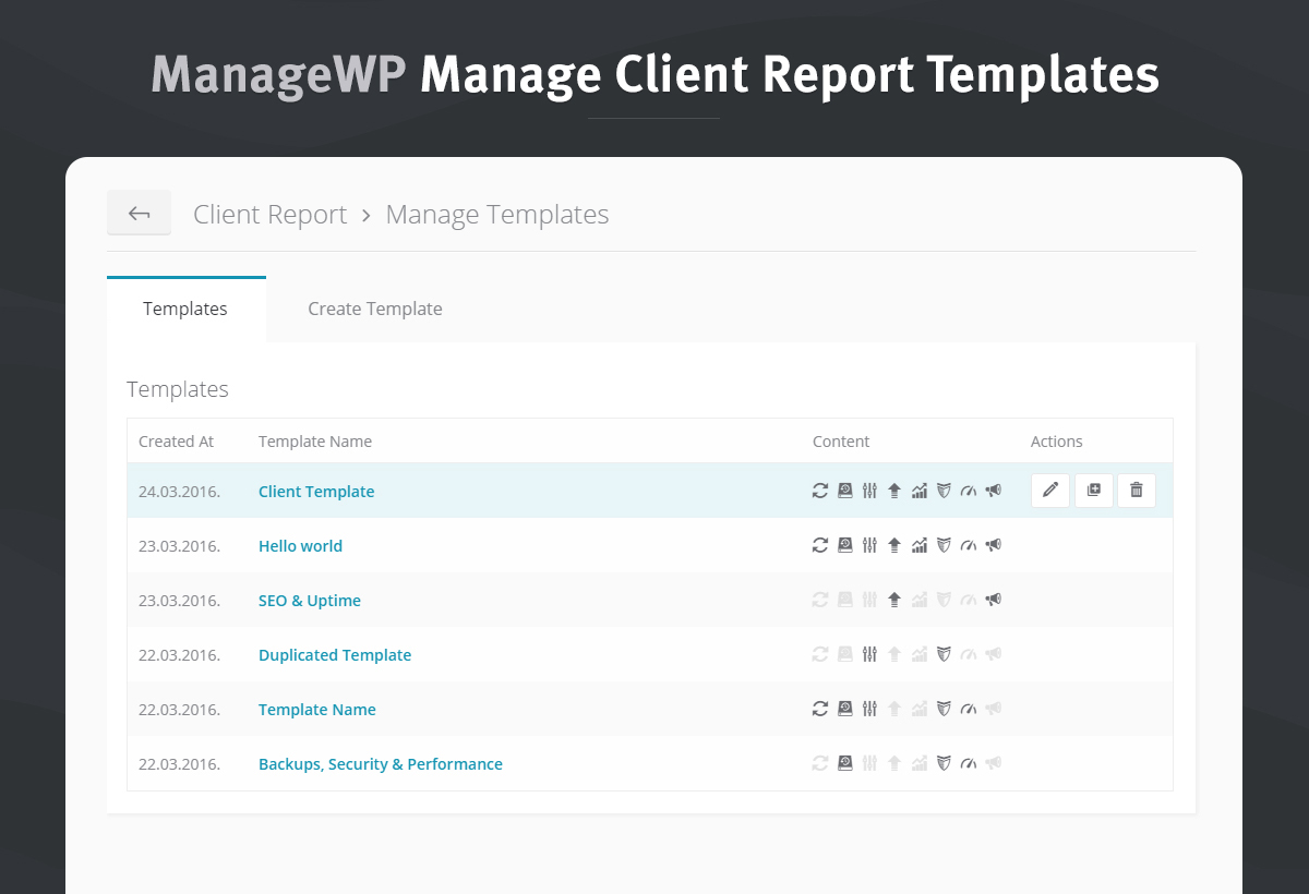 Okay, so we didn’t just want to give you a list of all the Client Reports you have made, we couldn’t stop there, so we have created a list of all of your templates and now you can manage them. Managing Templates has never been easier, with one click you can edit, duplicate and delete a template.