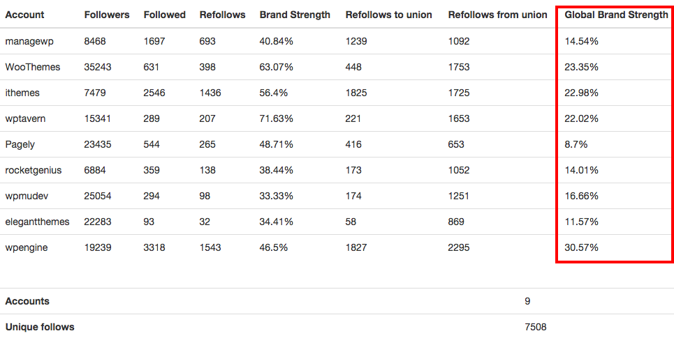 If we look only at the “local” level, refollows from just the people followed by each brand (in the “Brand Strength” column), WPTavern leads here, as 71% of the people they follow, follow them back (207 out of 289). Curiously, Page.ly is #4 according to this criteria, but it is in last place “globally,” which could indicate that they engage a lot with people closely related to their business but do not engage as much with people interested in other kind of WordPress products/services (an opportunity there?).