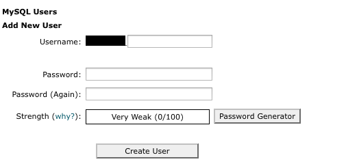Next, locate the MySQL Users section. Create a new user. You will need to create a username and password.