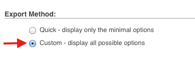 In phpMyAdmin, select your local WordPress database once again and click Export. Click on Custom when prompted for your preferred Export Method. This time, you’re going to select all tables to export and gzipped rather than zip.