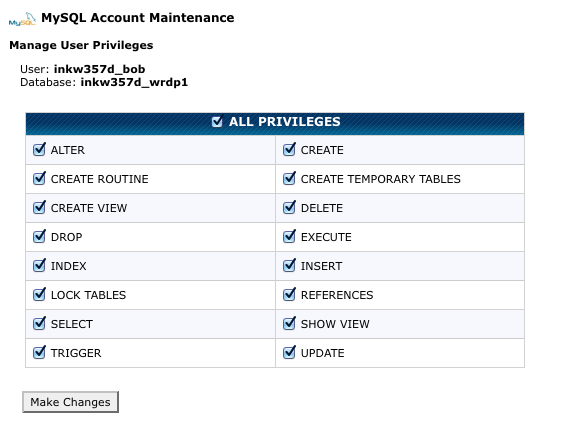 Finally, set the new user’s MySQL privileges. In order for this to work properly, the new user should be granted all privileges.